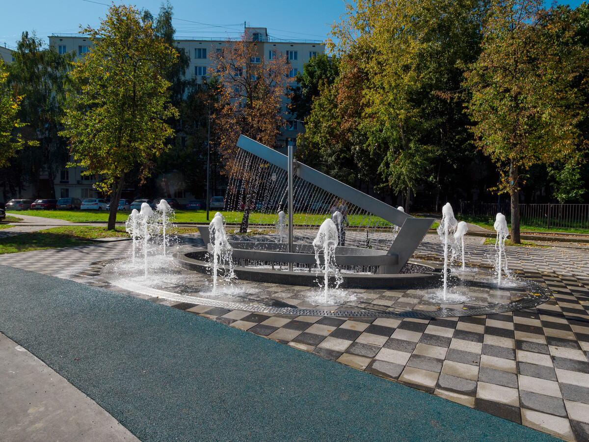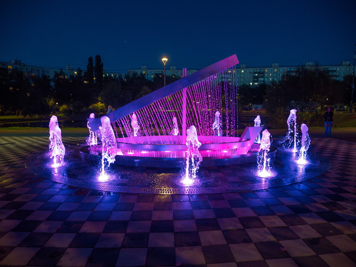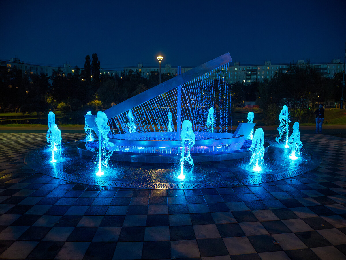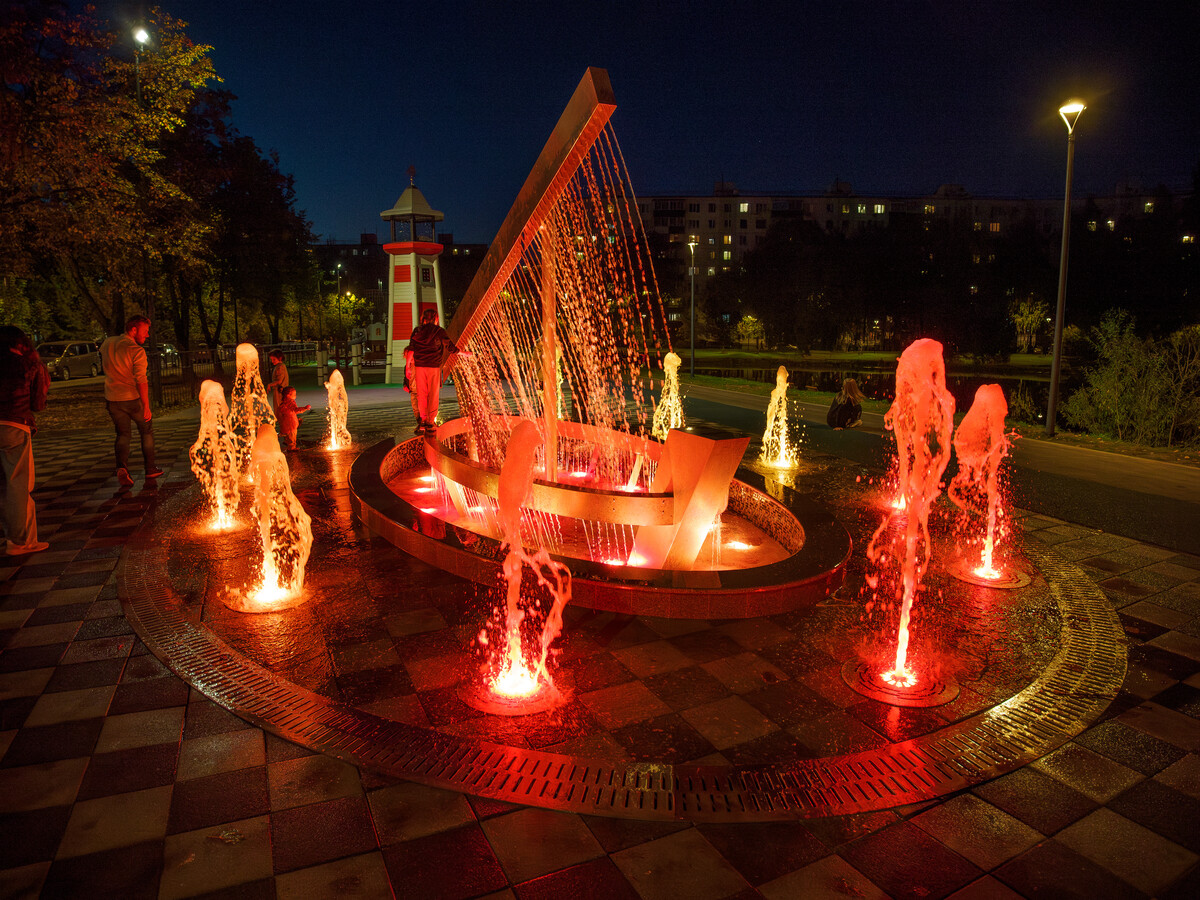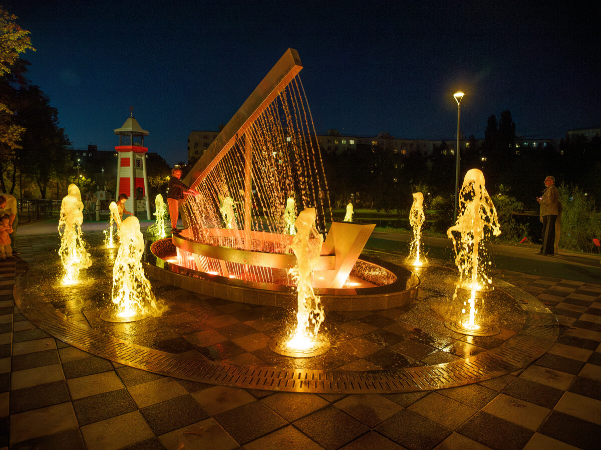Фонтан Парус, это готовый к работе цвето-динамический фонтан с несколькими водяными картинами и МАФ из нержавеющей стали. Фонтан сочетает в себе концепцию пешеходного и классического фонтана. Чаша фонтана облицована с внешней стороны гранитом, а дно фонтана выложено морозостойкой мозаикой. В чаше фонтана установлены RGB светодиодные светильники с PWM управлением. Пешеходная часть фонтана выложена тротуарной плиткой, в которую установлены фонтанные модули из нержавеющей стали. Каждый фонтанный модуль комплектуется фонтанной насадкой, RGBW светодиодным светильником с PWM управлением, и погружным насосом напряжением 24 вольта с DMX управлением.