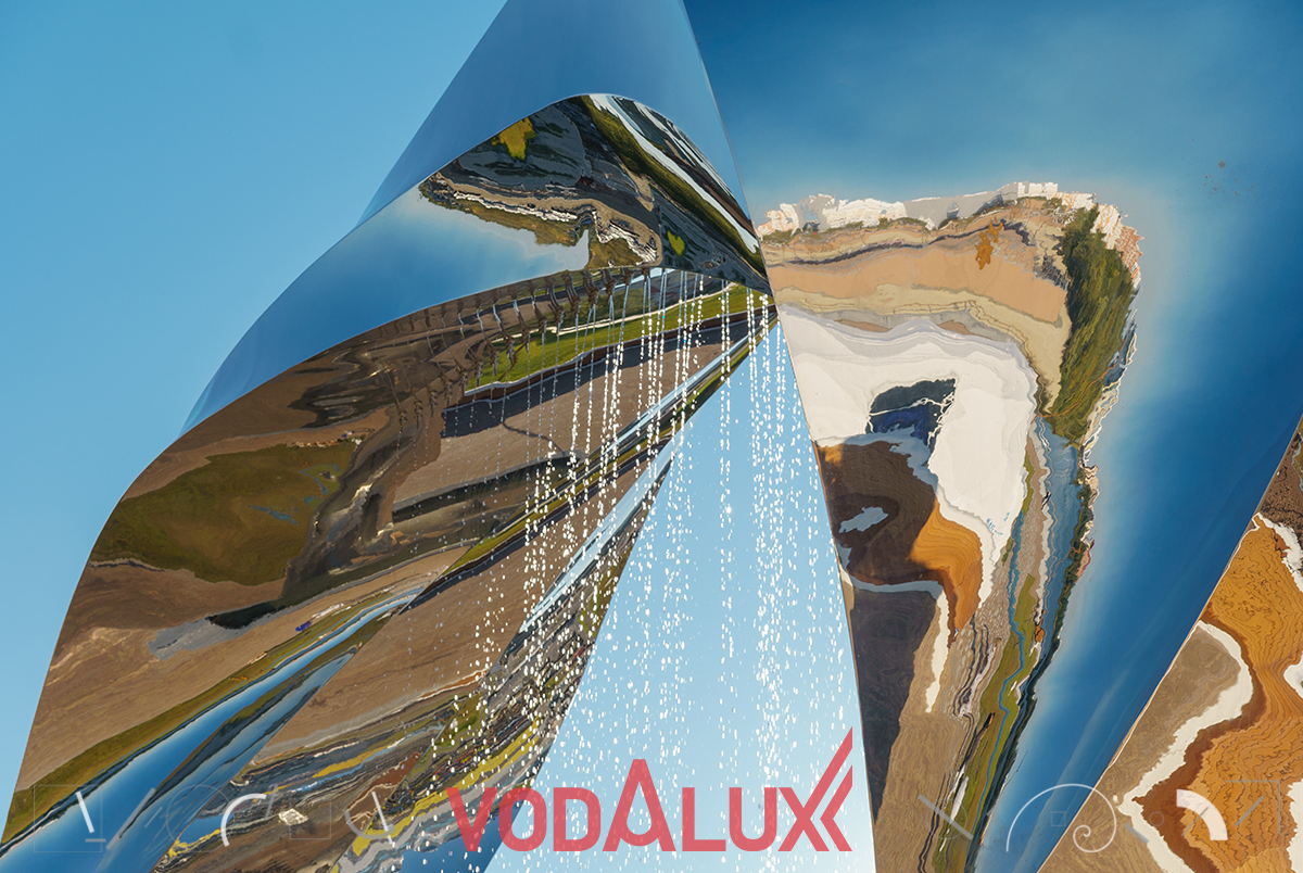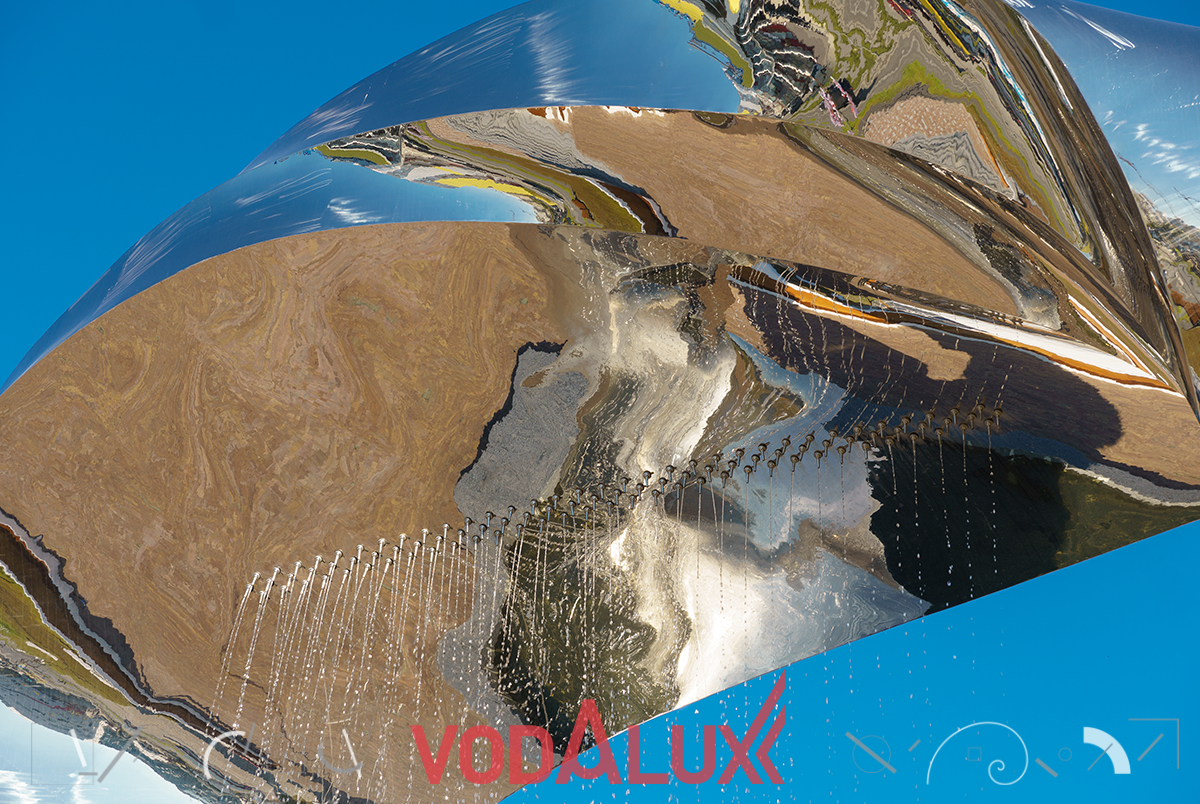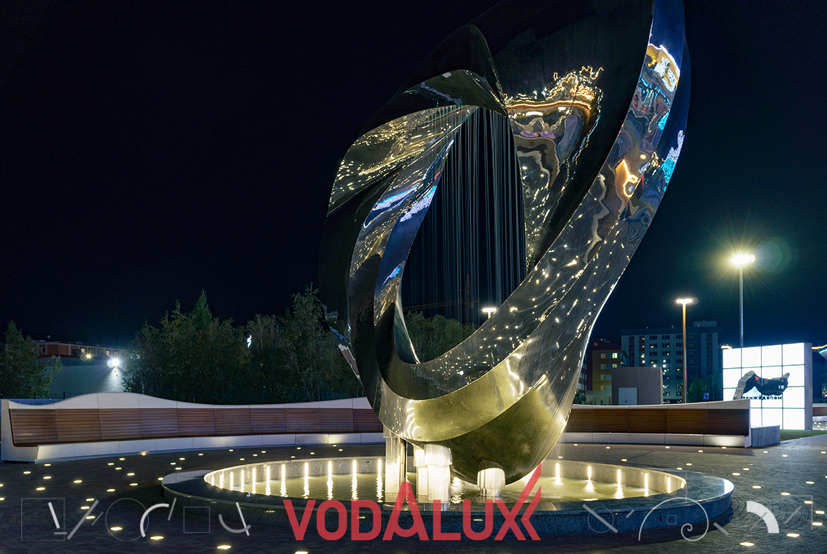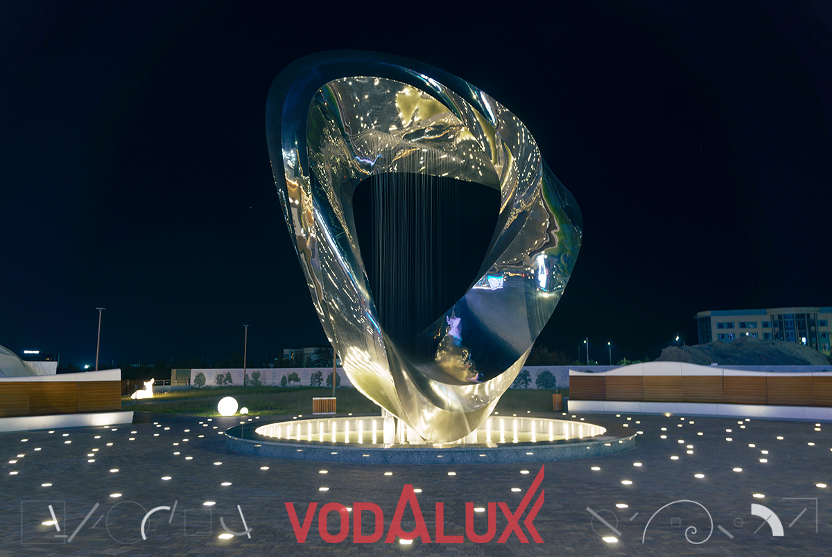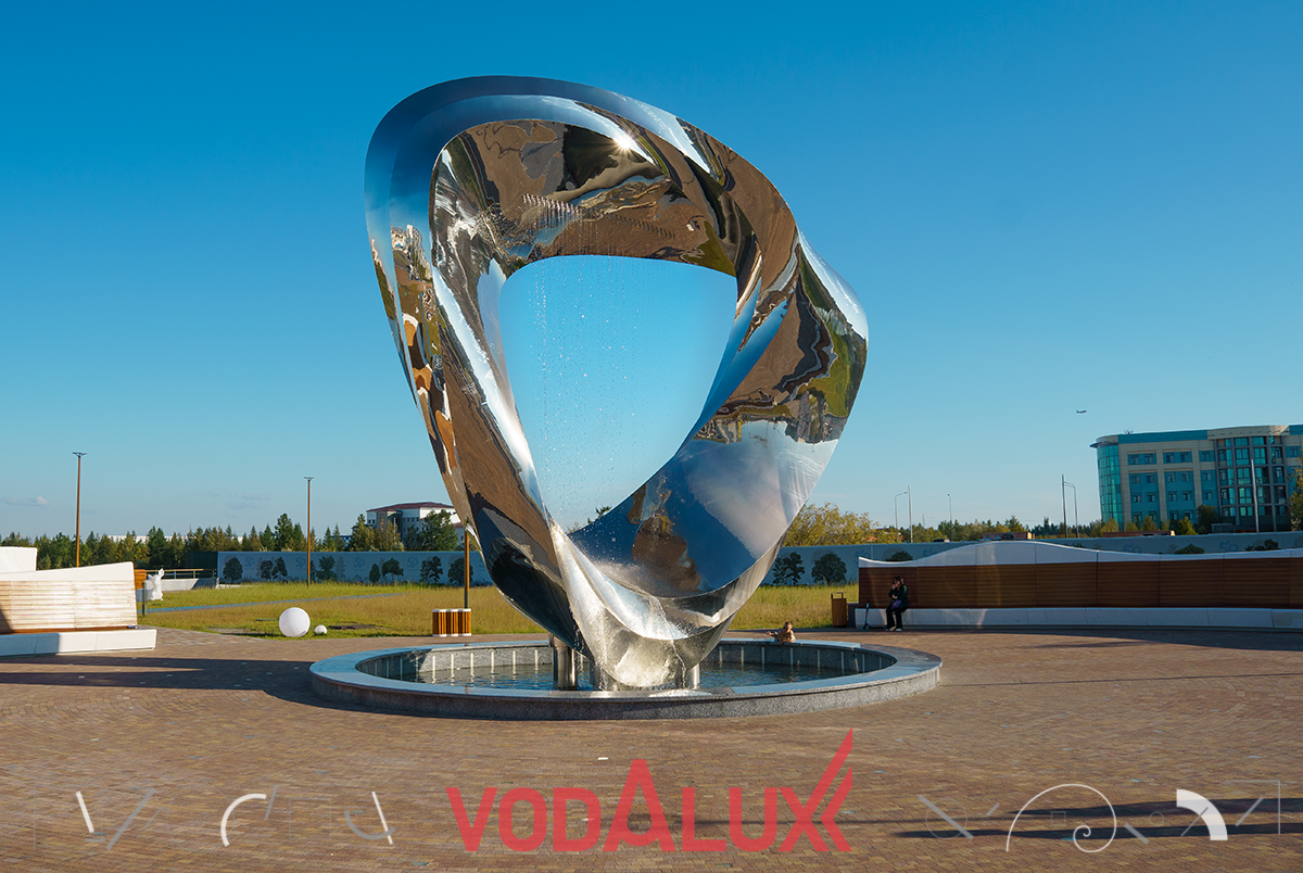 Минималистичный оригинальный фонтан из зеркального полированного металла открывает зону отдыха. Занавес из водных струй свободно опускается на нижнюю часть конструкции, создавая приятный шум водопада. Подсветка в чаше и за её пределами генерирует причудливые отблески ночью круглый год.